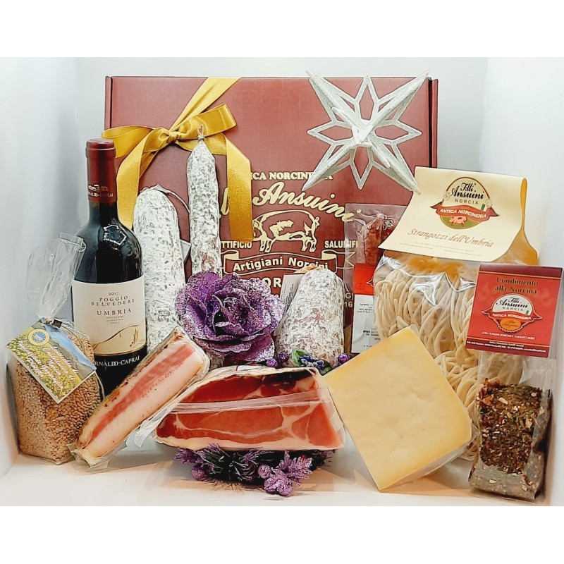 Cesto regalo MONTI DEL SOLE, un’ottima idea regalo con Prodotti Tipici Umbri, in particolar modo della tradizione Nursina.