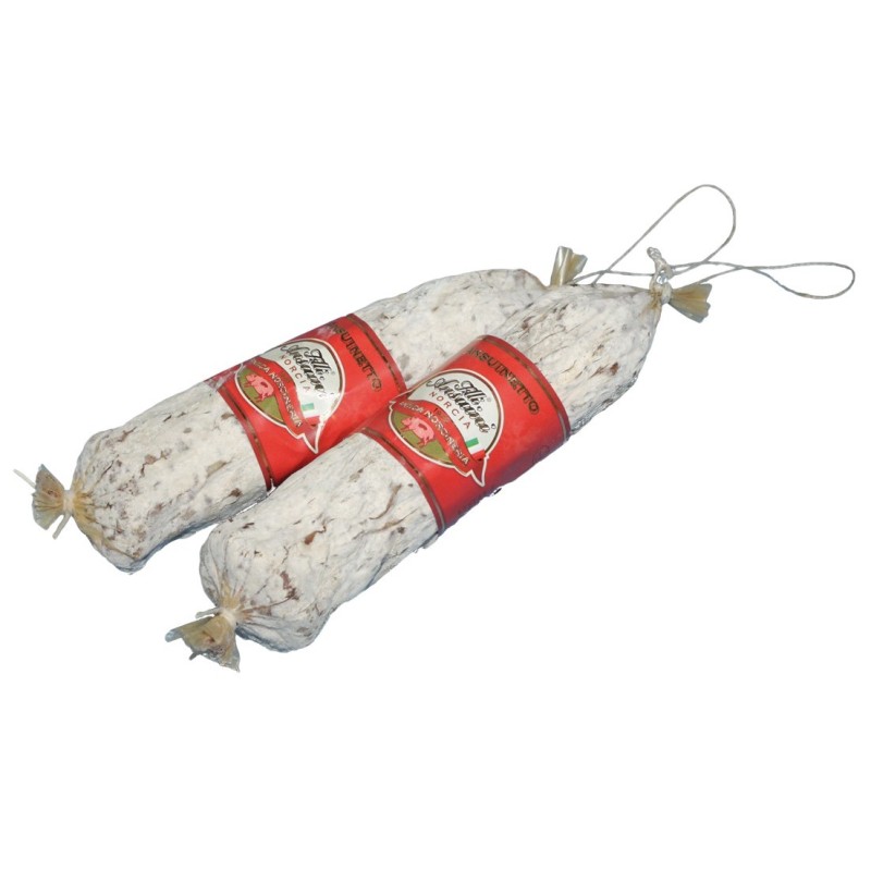 Salsiccia a grana fine. L'acquisto è possibile nei formati da 500 grammi o da 1 kg. Il Nursinetto si presenta con una muffa bianca esterna dovuta alla stagionatura.